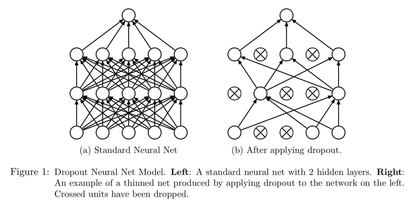 Figure from [Srivastava, Hinton, Krizhevsky, Sutskever, and Salakhutdinov (2014)](https://www.cs.toronto.edu/~hinton/absps/JMLRdropout.pdf). - Scaling of inputs: mean 0 and standard deviation 1. With standardized inputs, it is typical to take random uniform weights over the range [−0.7,+0.7]. - How many hidden units and how many hidden layers: guided by domain knowledge and experimentation. - Multiple minima: try with different starting values. ## Convolutional neural networks (CNN) Sources:{width=500px}