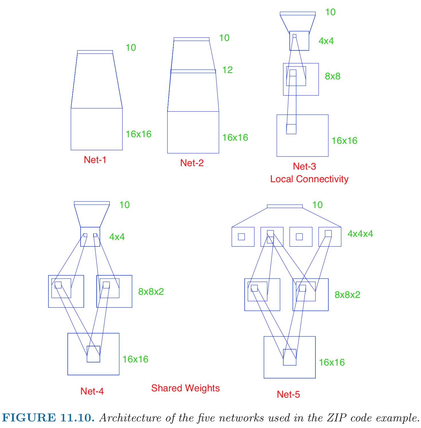 - Input: 256 pixel values from $16 \times 16$ grayscale images. Output: 0, 1, ..., 9 10 class-classification. - A modest experiment subset: 320 training digits and 160 testing digits. - net-1: no hidden layer, equivalent to multinomial logistic regression. net-2: one hidden layer, 12 hidden units fully connected. net-3: two hidden layers locally connected. net-4: two hidden layers, locally connected with weight sharing. net-5: two hidden layers, locally connected, two levels of weight sharing (was the result of many person years of experimentation).{width=500px}