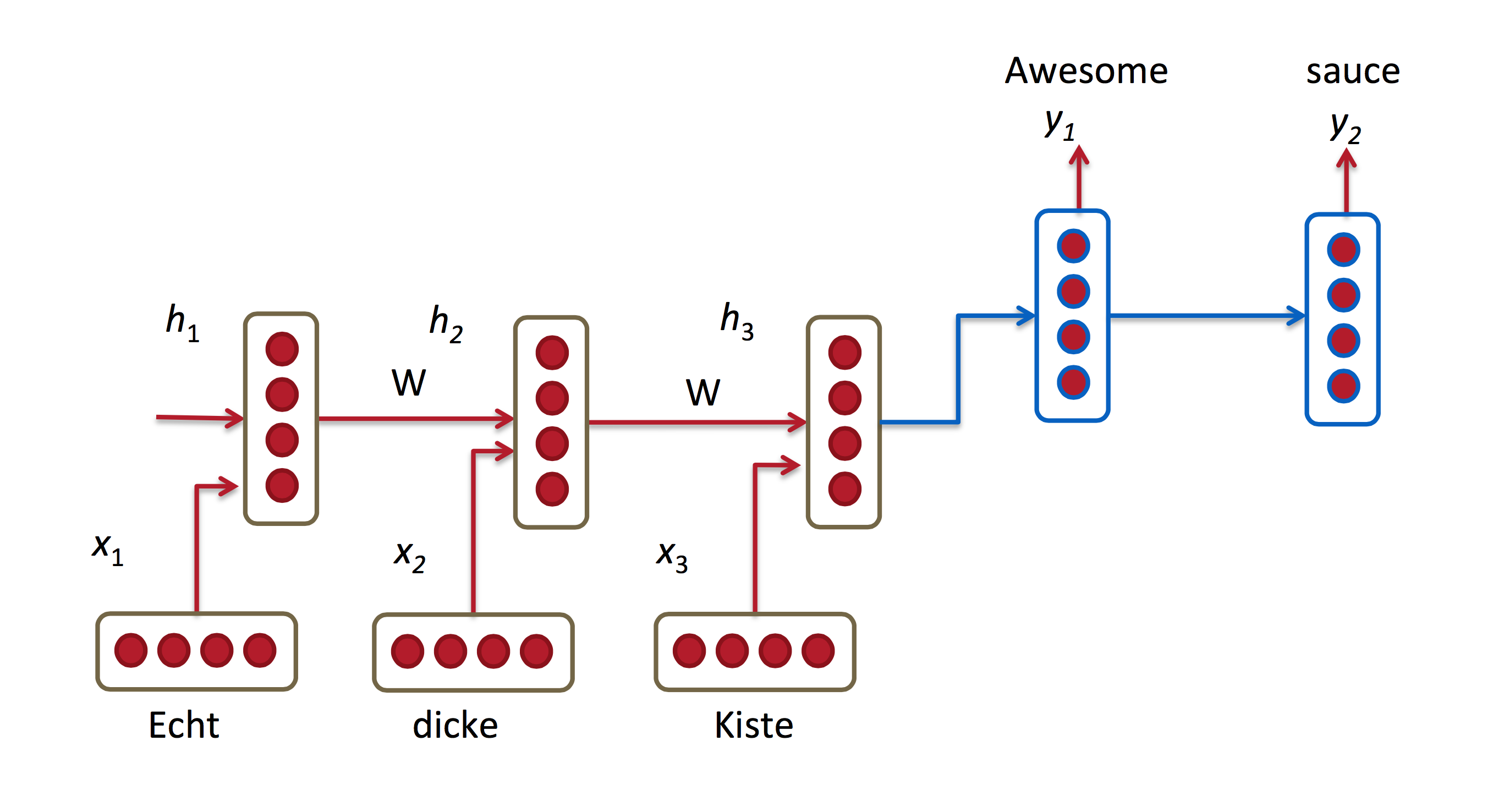 - RNNs accept an input vector $x$ and give you an output vector $y$. However, crucially this output vector’s contents are influenced not only by the input you just fed in, but also on the entire history of inputs you’ve fed in the past. - Short-term dependencies: to predict the last word in "the clouds are in the _sky_":{width=500px}