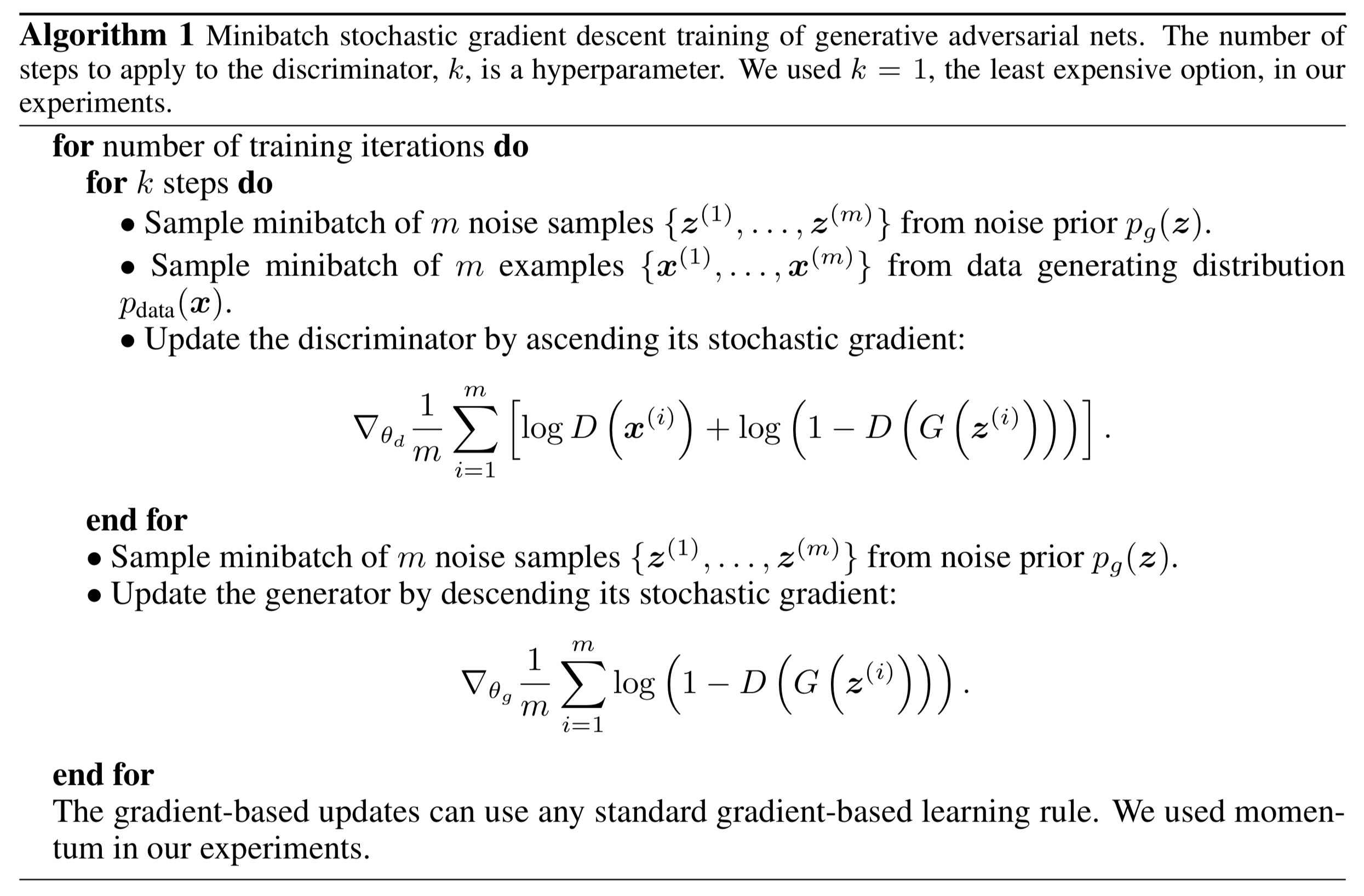 * Value function of GAN $$ \min_G \max_D V(D, G) = \mathbb{E}_{x \sim p_{\text{data}}(x)} [\log D(x)] + \mathbb{E}_{z \sim p_z(z)} [\log (1 - D(G(z)))]. $$ * Training GAN{width=600px}