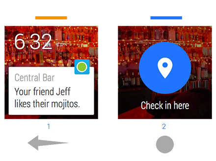Examples of how to chain together simple Android Wear UI components into common user flow patterns, from simple notifications to complex interactions involving full screen activities.