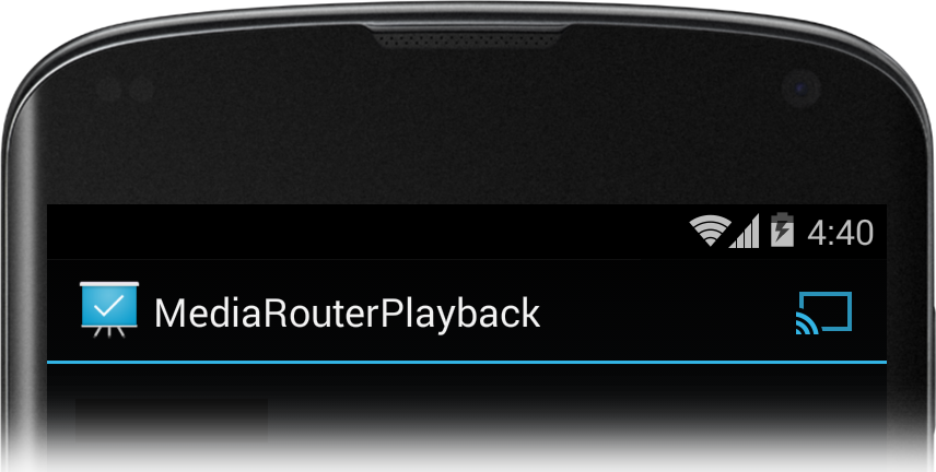 Android apps that implement the media router API should include a Cast button as part of their user interface, to allow users to select a media route to play media on a secondary output device. The media router framework provides a standard interface for the button, which you should use to help users recognize and use the feature in your app. Figure 2 illustrates how the Cast button should appear in an app.