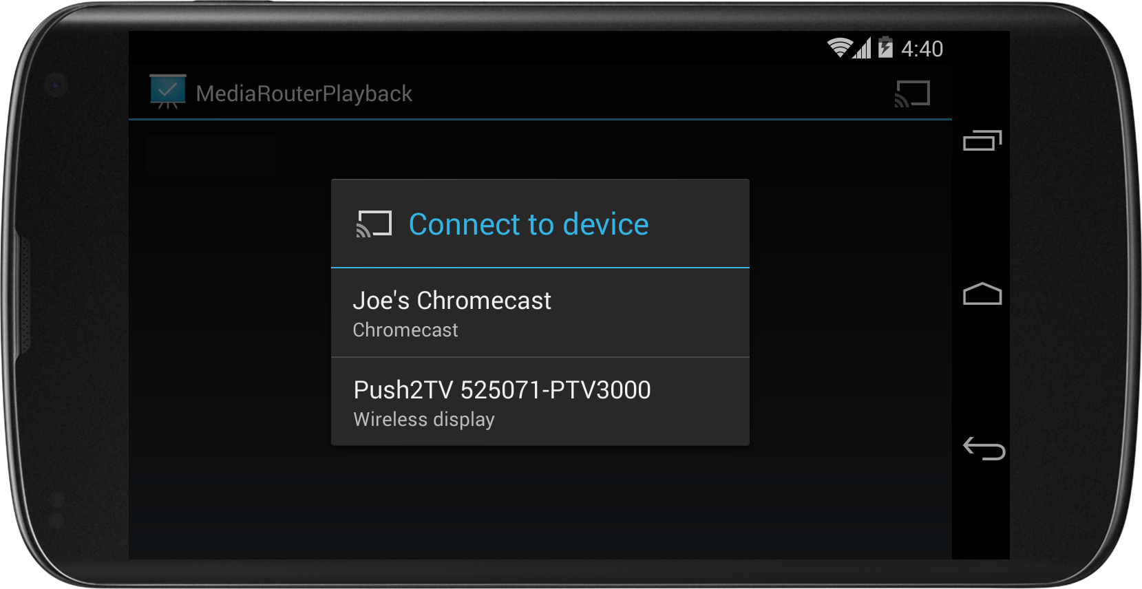 When a user presses the Cast button, the media router framework looks for available media routes and presents a list of choices to the user, as shown in figure 3.