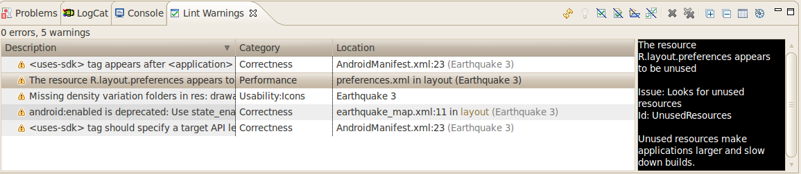 linttool on your project by right-clicking on your project folder in the Package Explorer and selecting Android Tools > Run Lint: Check for Common Errors. This action brings up the Lint Warnings view which displays a list of issues thatlintdetected in your project. - From the Lint Warnings view, use the toolbar options to configure