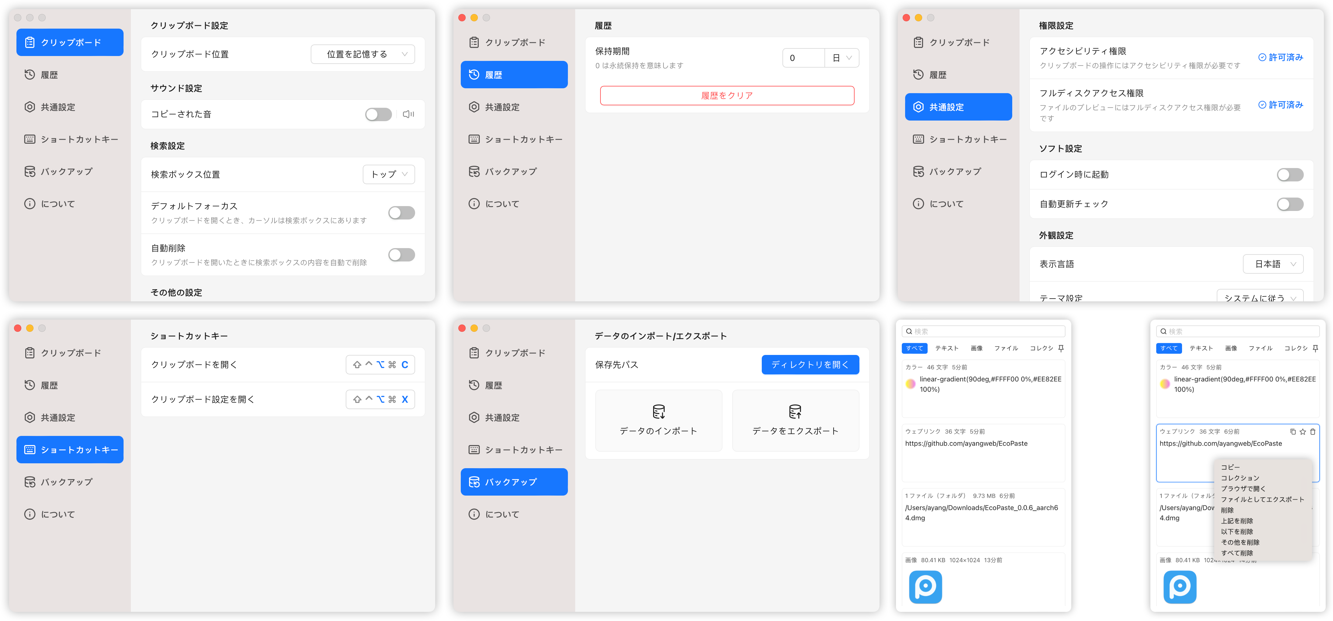 - 📋 テキスト、リッチテキスト、HTML、画像、ファイル形式のクリップボード内容をサポートできる。