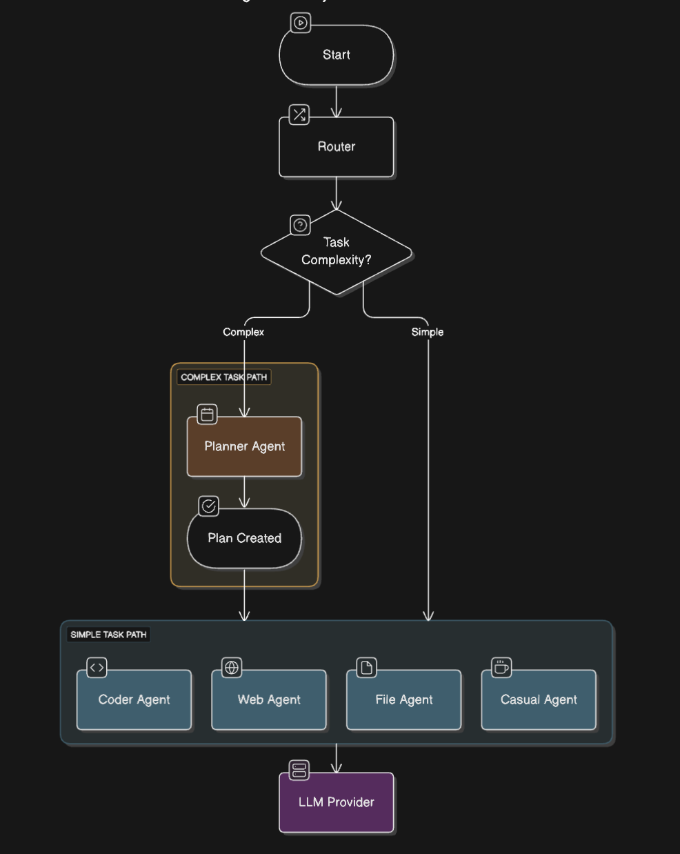 The agent selection is done in 4 steps: 1. determine query language and translate to english for the zero-shot model and llm_router. 2. Estimate the task complexity and best agent. - If HIGH complexity: return the planner agent. - If LOW complexity: Determine the best agent for the task using a vote system between 2 classification models. 3. Process high complexity query. - If task was high complexity, planner agent will create a json plan to divide and conqueer the task with multiple agent. 4. Proceed with task(s) ## 2. Agents ### File/Code agents