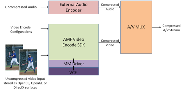 Figure 1 — System overview of the AMF Video Encode SDK The AMF Video Encoder Component compresses RAW uncompressed video to an HEVC elementary bitstream. The component does not provide a mechanism to handle audio compression, or stream multiplexing. The component provides four different sets of pre-defined usages, which provide a convenient way for developers to configure the encoder to match the intended application use case. Advanced developers can also adjust encoding parameters to tailor the behavior to their specific application requirements. HEVC encoding is currently supported on Windows only. ### 1.2 Pre-defined Encoder Usages The following table provides a brief overview of the encoding usage modes that have been defined: | Usage Mode | Intended use-cases | Comments | | :---------------- | :---------------------------------- | :------------------------------------------------------------------------------------------------------------------------------- | | Transcoding | Transcoding, video editing | Favor compression efficiency and throughput over latency. | | Ultra-low latency | Video game streaming | Optimize for extremely low latency use cases (e.g. cap the number of bits per frame), to enable high-interactivity applications. | | Low Latency | Video collaboration, remote desktop | Optimize for low latency scenarios, but allow occasional bitrate overshoots to preserve quality. | | Webcam | Video conferencing | Optimize for a low-latency video conferencing scenario. | | HQ | High quality mode | Optimize for best subjective video quality with possible loss of performance. | | HQLL | High quality low latency mode | Optimize for good quality with low latency. |