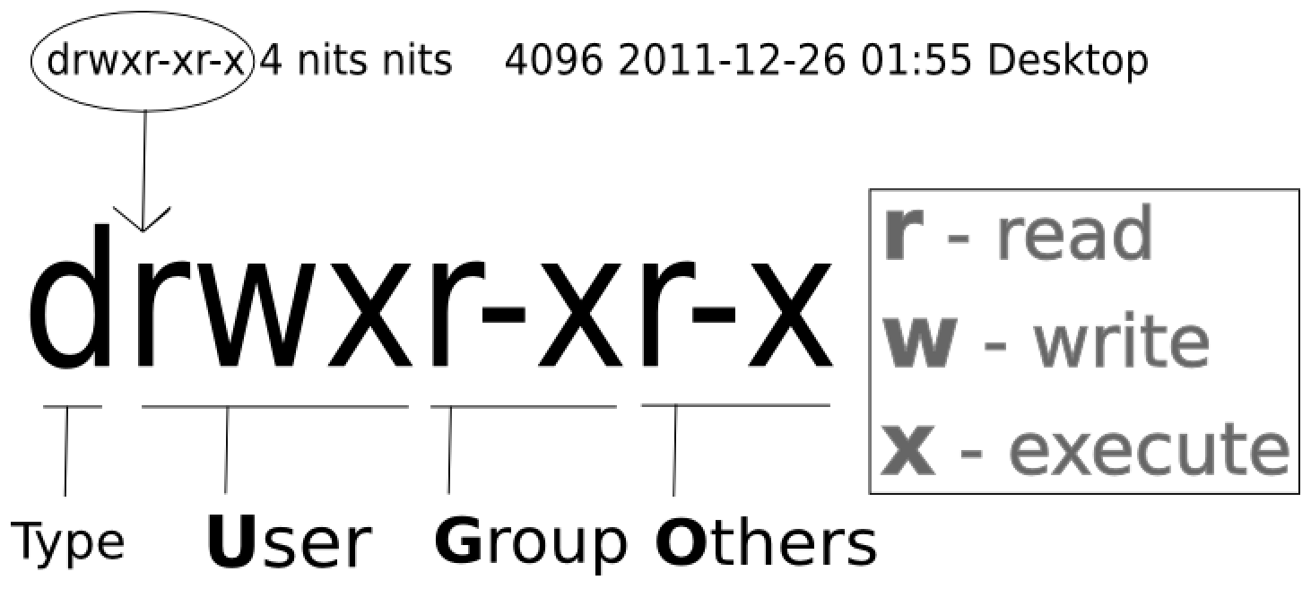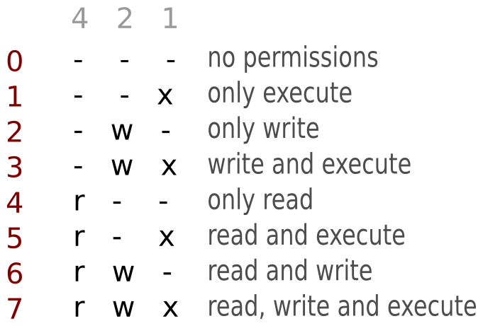 - `chmod 751 file` sets permission `rwxr-x--x` to a file.