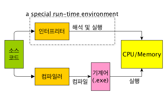 { "cells": [ { "cell_type": "markdown", "metadata": {}, "source": [ "***\n", "***\n", "# 1회. Python 시작하기\n", "***\n", "***" ] }, { "cell_type": "markdown", "metadata": {}, "source": [ "***\n", "## 1. 스크립트 언어의 이해\n", "***" ] }, { "cell_type": "markdown", "metadata": {}, "source": [ "### 1-1 스크립트(Script) 언어란 무엇인가?\n", "- 스크립트(scripts)의 사전적 의미 - 연극의 대사등이 적혀 있는 스크립트에서 유래\n", "- Script Language의 wikipedia 정의 (http://en.wikipedia.org/wiki/Scripting_language)\n", " - a programming language that supports scripts, programs written for a special run-time environment that can interpret (rather than compile) and automate the execution of tasks that could alternatively be executed one-by-one by a human operator" ] }, { "cell_type": "markdown", "metadata": {}, "source": [ "### 1-2 컴파일 언어와 스크립트 언어와의 비교 \n", "- 컴파일(Compile) 방식의 언어에 의해 작성되는 응용 프로그램은 컴파일러에 의해 기계어로 번역된 채로 실행되기 때문에, 수정이 빈번하게 발생할 경우에는 수정 후 다시 컴파일을 해야함.\n", " - 덩치가 큰 프로그램은 컴파일 시간이 꽤 길다. 즉, 간단한 수정에도 오랜기간의 컴파일 시간이 요구된다. " ] }, { "cell_type": "markdown", "metadata": {}, "source": [ "" ] }, { "cell_type": "markdown", "metadata": {}, "source": [ "- 반면에 수정이 빈번하게 발생하는 경우에는 소스 코드를 한줄 한줄 읽어 바로바로 실행하는 인터프리터 방식이 상당히 유리하다. \n", "- 스크립트 소스코드를 컴파일 방식에 의해 중간 코드(Bytecode)로 우선 만들고, 이를 다시 인터프리터 방식으로 해석하여 수행하는 방법도 종종 활용된다." ] }, { "cell_type": "markdown", "metadata": {}, "source": [ "" ] }, { "cell_type": "markdown", "metadata": {}, "source": [ "- 스크립트 언어의 장점\n", " - 개발 시간이 단축된다.\n", " - 소스 코드 수정이 빠르고 간단하게 이루어진다.\n", "- 스크립트 언어의 단점\n", " - 중간 코드를 만드는 것은 간단하지만 그것을 실제로 실행시키는 것은 많은 작업을 필요로 한다.\n", " - 실행 시간이 오래 걸린다." ] }, { "cell_type": "markdown", "metadata": {}, "source": [ "### 1-3 대표적인 스크립트 언어 \n", "- JavaScript\n", "- ActionScript\n", "- Perl\n", "- PHP\n", "- Python\n", "- Lua\n", "- Ruby" ] }, { "cell_type": "markdown", "metadata": {}, "source": [ "***\n", "## 2 파이썬 언어의 유래 및 파이썬 언어의 특징\n", "***" ] }, { "cell_type": "markdown", "metadata": {}, "source": [ "### 2-1 파이썬(Python)의 사전적 의미" ] }, { "cell_type": "markdown", "metadata": {}, "source": [ "- Python의 사전적 의미는 독이 없는 뱀으로 먹이를 몸으로 감아서 압사시키는 큰뱀, 또는 그리스 신화에 나오는 악마" ] }, { "cell_type": "markdown", "metadata": {}, "source": [ "### 2-2 왜 파이썬이란 이름이 붙었나?" ] }, { "cell_type": "markdown", "metadata": {}, "source": [ "- 프로그래밍 언어로서 Python 이름의 유래는 1970년대에 영국 BBC에서 방영한 \"Monty Python's Flying Circus\" 방영 프로그램에서 유래되었다. 이 프로그램은 매우 어색하고 이상한 행동을 보이는 사람들을 쇼형태로 방영하여 많은 인기를 누렸다. \n", "- 이 언어를 만든 Guido van Rossum이 이 프로그램의 대단한 팬이었기 때문이었다. \n", "- 1989년 12월 크리스마스 휴가를 보내고 있던 Guido는 휴가 기간동안 무엇인가 재미있게 할 수 있는 무언가를 찾고 있었다. \n", "- 연휴라서 연구실이 닫힌 상황에서 집에서 컴퓨터를 가지고 예전부터 생각하고 있었던 인터프리터(interpreter)를 만들어 보기로 결심하였다. \n", "- 즉, Guido가 무료한 한때를 보내기 위하여 만들기 시작했던 언어가 지금 많은 사람들이 사용하는 Python 언어가 되었다." ] }, { "cell_type": "markdown", "metadata": {}, "source": [ "### 2-3 파이썬의 출발" ] }, { "cell_type": "markdown", "metadata": {}, "source": [ "- 파이썬의 기반은 80년대 초반에 Guido가 동료들과 함께 개발을 하였던 ABC라는 언어이다. \n", "- 80년대에 ABC라는 언어는 최고의 교육용 언어로 알려졌었고 전문 프로그래머가 아닌 사람이 배우기 편하게 만들어진 아주 훌륭한 언어였다. \n", "- 그럼에도 불구하고 전문 프로그래머들에게는 거의 받아 들여지지도 않았고 잘 사용되지도 않았다.\n", "- 이는 프로그래밍이 대중화가 많이 되지 않은 상황에서 전문 프로그래머들에게 외면받았을 때에 나올 수 있는 결과라고 볼 수 있다. \n", "- Guido는 파이썬으로 실제 문제를 더욱더 쉽게 해결할 수 있도록 설계하였으며 C언어나 유닉스 쉘을 대신해서 좀 더 편하게 사용할 수 있는 언어를 개발하는 데 초점을 맞추었다. " ] }, { "cell_type": "markdown", "metadata": {}, "source": [ "### 2-4 왜 파이썬을 배워야 하는가?" ] }, { "cell_type": "markdown", "metadata": {}, "source": [ "- 가장 중요한 대답: \"생산성이 높기 때문\"\n", "- 먼저 개발하라! 그리고 나서 성능을 개선하라." ] }, { "cell_type": "markdown", "metadata": {}, "source": [ "### 2-5 파이썬은 어떤 언어인가?" ] }, { "cell_type": "markdown", "metadata": {}, "source": [ "- 대화 기능의 인터프리터 언어\n", "- 동적인 데이터 타입 결정 지원" ] }, { "cell_type": "code", "execution_count": 1, "metadata": {}, "outputs": [ { "name": "stdout", "output_type": "stream", "text": [ "3\n", "abcdef\n", "[1, 2, 3, 4, 5, 6]\n" ] } ], "source": [ "def add(a,b):\n", " return a+b\n", "\n", "print(add(1,2))\n", "print(add('abc', 'def'))\n", "print
