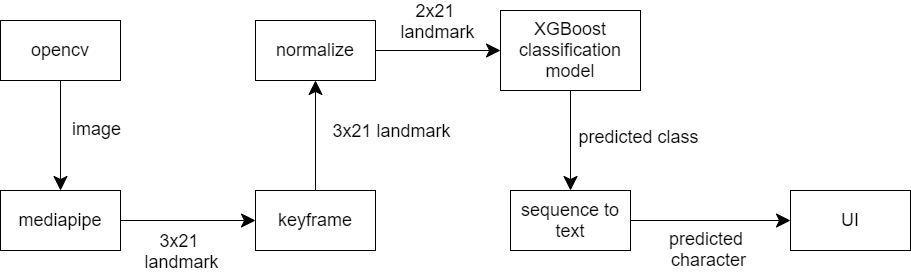 หลักการทำงานเบื้องต้นคือ MediaPipe จะทำ Palm Detector เพื่อหาขอบเขตของมือในภาพ จากนั้นนำไปเข้า Hand Landmark Model เพื่อระบุ keypoint ทั้ง 21 จุด โดยแต่ละจุดประกอบไปด้วยตัวเลข 3 ตัวแทนพิกัดในแกน x, y, z