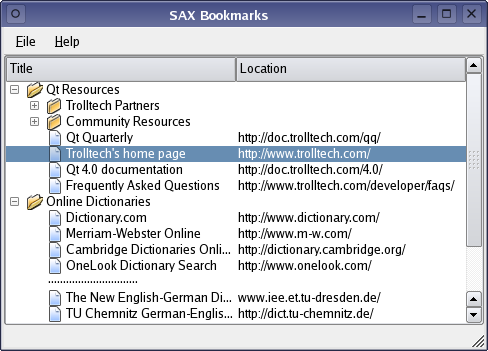 This example uses Qt's SAX API to read and parse the files. The DOM Bookmarks example provides an alternative way to read this type of file.