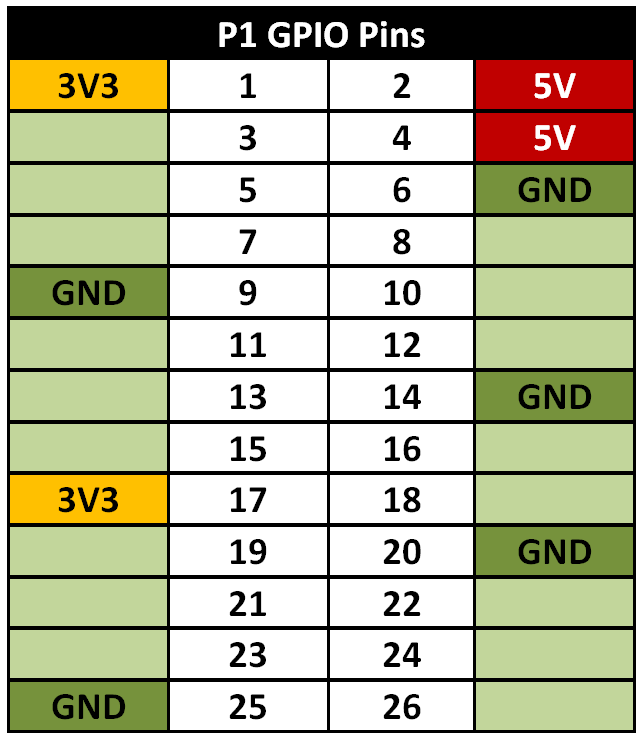 The Raspberry Pi has a pin connector (GPIO Header) which includes 26 (17 on older models) general purpose input output pins, which provide the ability to digital control of hardware or sensing of digital signals. The pin header also contains several power (5V & 3.3V) and ground pins, as shown below.