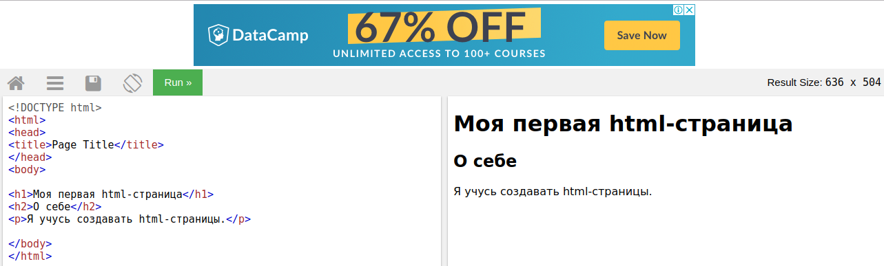 `. \n", "\n", "Для заголовков используются тэги с `h` (`h` – от *header*). Тэги `` ‒ для заголовков первого уровня, тэг `` – для заголовков уровня, и так далее. В тэги `` заключаются абзацы (`p` – от *paragraph*). Давайте для начала внесем изменения в файл ‒ создадим страничку о себе. Можете скопировать код ниже в поле на странице *Try it Yourself* и нажать кнопку *Run*." ] }, { "cell_type": "code", "execution_count": null, "metadata": {}, "outputs": [], "source": [ "\n", "\n", "\n", "Я учусь создавать html-страницы.