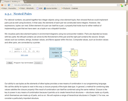 VISUALIZE Python, Java, JavaScript, TypeScript, Ruby, C, and C++ programsPython Tutor, created by Philip Guo, helps people overcome a fundamental barrier to learning programming: understanding what happens as the computer executes each line of a program's source code. Using this tool, you can write Python, Java, JavaScript, TypeScript, Ruby, C, and C++ programs in your Web browser and visualize what the computer is doing step-by-step as it executes those programs. So far, over 1.5 million people in over 180 countries have used Python Tutor to visualize over 15 million pieces of code, often as a supplement to textbooks, lecture notes, and online programming tutorials. For example, here is a visualization showing a Python program that recursively finds the sum of a linked list: Read the research paper – Philip J. Guo. Online Python Tutor: Embeddable Web-Based Program Visualization for CS Education. In Proceedings of the ACM Technical Symposium on Computer Science Education (SIGCSE), March 2013. [BibTeX] |