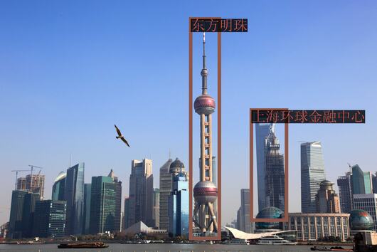 次に、プロンプト ```请给我框出图中上海环球金融中心和东方明珠``` を使ってモデルと会話してみましょう。このとき、```history=history``` を使って、以前の会話の履歴を ```model.chat``` に渡す必要があることに注意してください。
