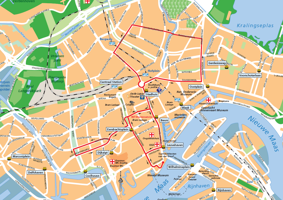 De route van de tramparade door het centrum van Rotterdam. Klik op de afbeelding voor een vergroting.