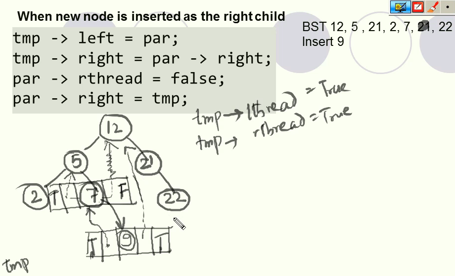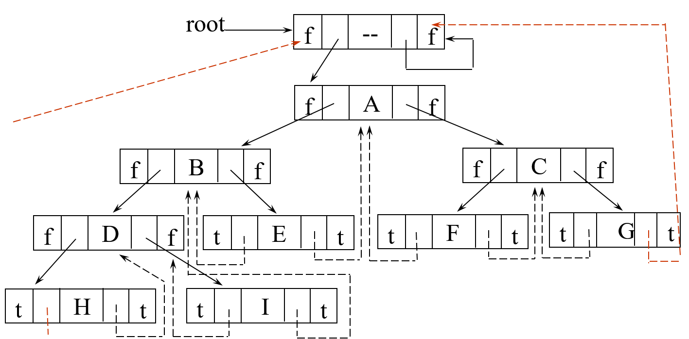 - If `ptr->left_child` is `null`, replace it with a pointer to the node that would be *visited before ptr* in an inorder traversal (**inorder predecessor**)