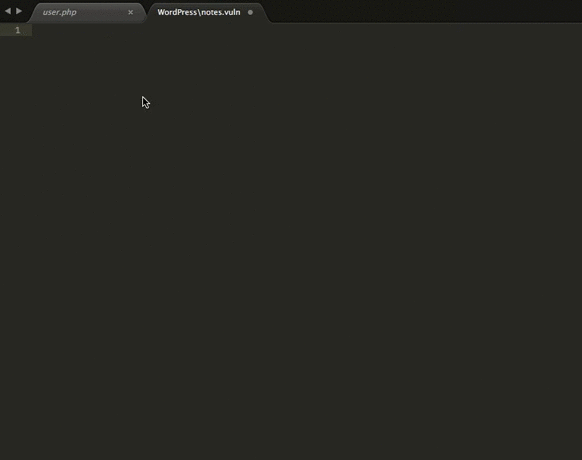 # Sublime Vuln Plugin This plugin can be used by Pentesters/Code auditors to easy create note files from source code. Select some vulnerable code and invoke the vuln command (exists in command palette) and the selected code will be copied along with filename and line numers into the note file. The package also includes syntax highlightning for notes files.