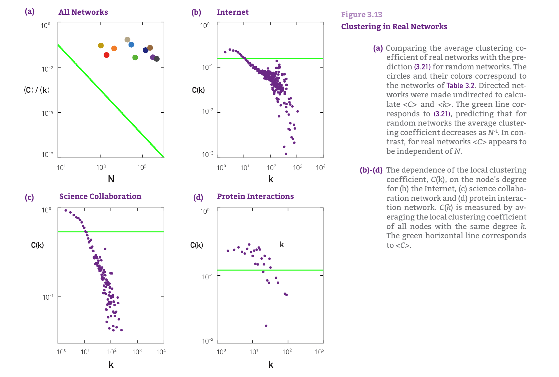 "- Instead real networks have a **much higher clustering coefficient** than expected for a random network of similar N and L. \n",