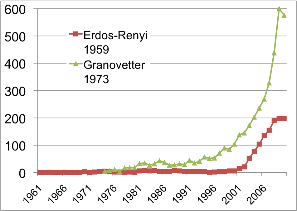 "The explosive interest in network science is well documented by the citation pattern of two classic network papers, the 1959 paper by Paul Erdos and Alfréd Rényi that marks the beginning of the study of random networks in graph theory [4] and the 1973 paper by Mark Granovetter, the most cited social network paper [5]. \n",