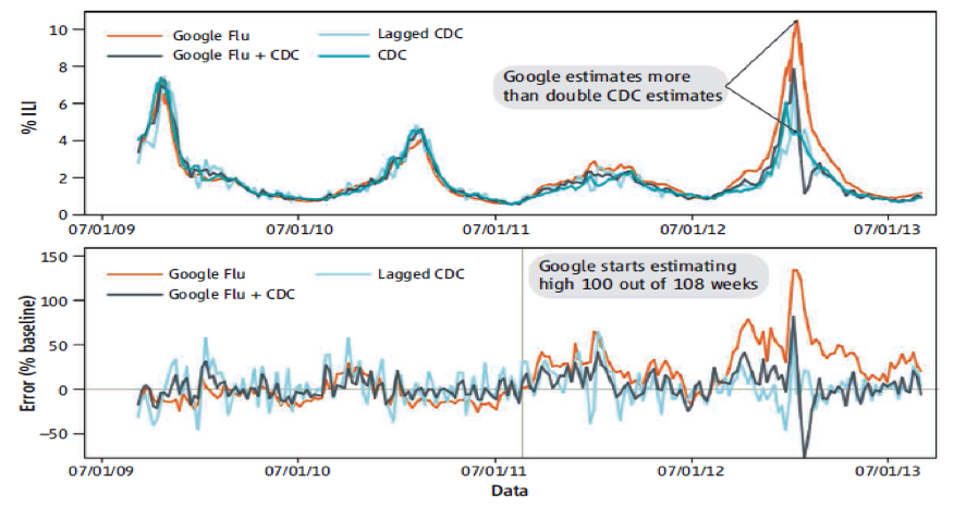 "“Nature reported that Google flu trends (GFT) was predicting more than double the proportion of doctor visits for influenza-like illness (ILI) than the Centers for Disease Control and Prevention (CDC), which bases its estimates on surveillance reports from laboratories across the United States (1, 2).”\n",