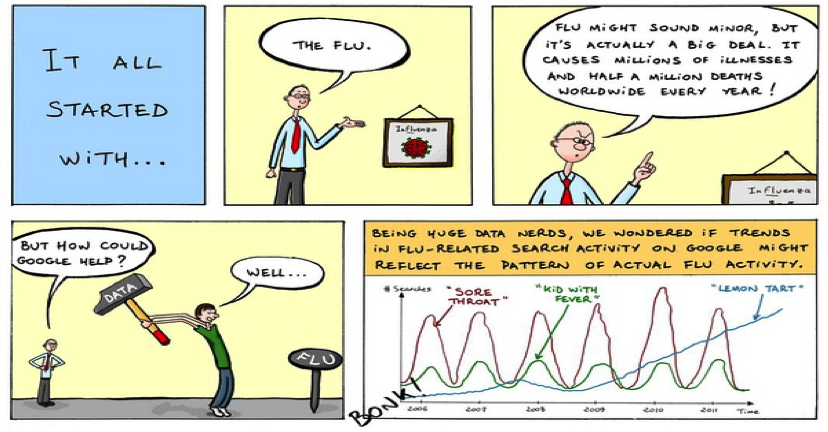 "“Nature reported that Google flu trends (GFT) was predicting more than double the proportion of doctor visits for influenza-like illness (ILI) than the Centers for Disease Control and Prevention (CDC), which bases its estimates on surveillance reports from laboratories across the United States (1, 2).”\n",
