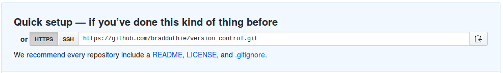After you click the green button 'Create repository', GitHub will take you to a place that gives you a URL for a quick setup. The URL for the version_control repository that I just set up is below.