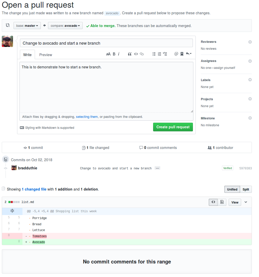Creating a new branch will immediately take you to the pull request screen below. This will send a request to merge the change that you've just made with the master branch (i.e., a '[pull request](https://github.com/StirlingCodingClub/version_control/pull/1)') -- it let's you know that the branches can be merged without any [merge conflict](#step6), and shows the change that you made at the bottom of the secreen (removing 'Tomatoes' and adding 'Avacodo').
