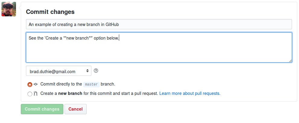 With no need to push or pull in GitHub itself, we can move to using branches in GitHub. You can create a branch whenever you edit a file by selecting the 'Create a **new branch** for this commit and start a pull request' radio button below your commit message.