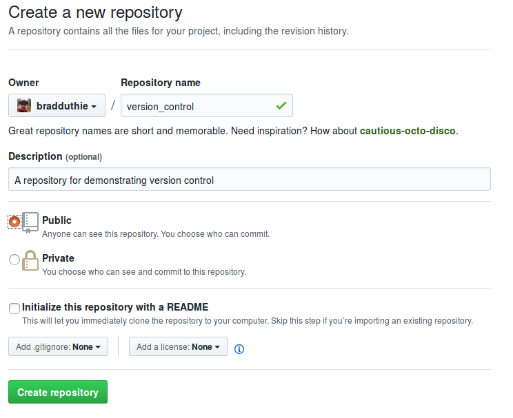 This will take you to the page that allows you to set up a new repository. **Be sure to use the same repository name on GitHub that you do on your local computer**, and avoid the use of spaces.
