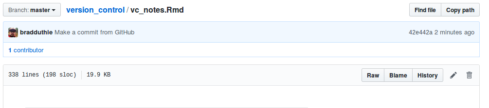 You now know how to push changes to GitHub using both GitKraken and the command line. Pulling changes from GitHub works in roughly the same way. Say that I am away from my office computer, but have logged into my account on a public computer to [make changes to this Rmd file](https://github.com/bradduthie/version_control/edit/master/vc_notes.Rmd) directly from the browser. I commit these changes in the browswer using the GitHub interface, but now need to bring these changes into my home computer and GitKraken from GitHub. As a reminder, if you ever want to edit a text file within GitHub, select the file in your GitHub repository, then click on the pencil icon to the left of the rubbish bin icon.