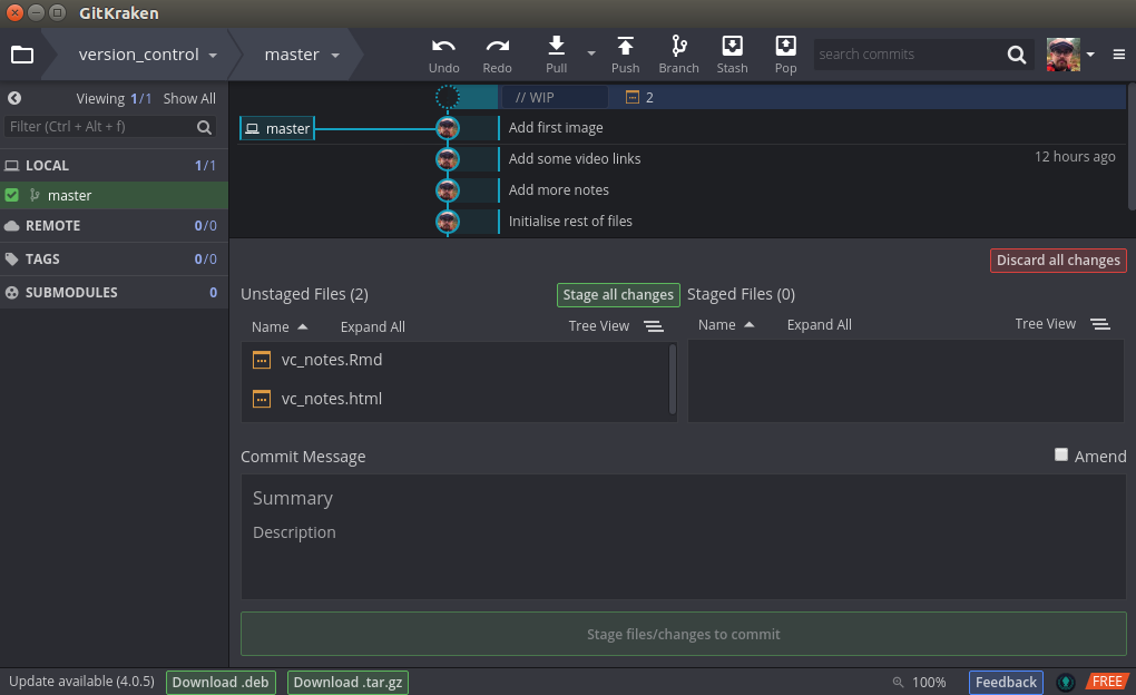 Now assume that we want to commit the changes we have saved, establishing a snapshot of the directory that we can return to in the future. The common wisdom in using version control is **"commit early, commit often"**, meaning that it is generally better to err on the side of commiting changes that you make to your repository more often than you think is necessary. In practice, I try to commit frequently, almost as often as I save file changes; even small changes can be useful to have their own commit because the changes are easier to read in small chunks rather than massive changes to files. To commit our changes, we need to 'stage' the files. You can stage all of the changed files at once, if desired, or you can stage only a subset of them (if, e.g., you wanted to record a change in one file, but wait to commit changes in another file). In GitKraken, staging is done simply by hovering over the file of interest in the 'Unstaged files' field, then clicking on the green 'Stage file' box that appears to the right of it. If you instead want to stage all files, then you can click on the 'Stage all changes' box in green.