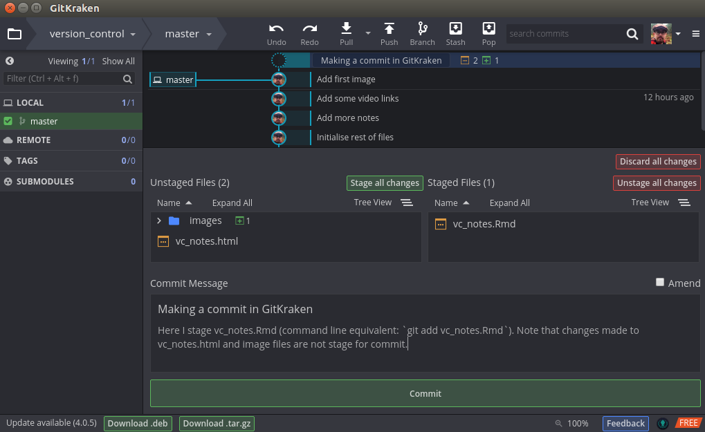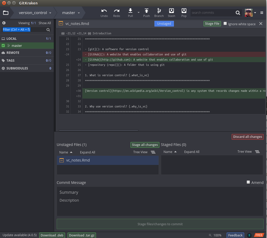 One last thing with respect to staging and committing files. One very useful feature of git is the ability to see changes that are made to files from one commit to the next. You can do this in GitKraken simply by clicking the staged, unstaged, or already committed file. What you'll see is a record of the changes that have been made since the previous commit.