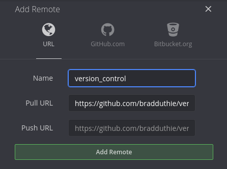 Copy that URL, then go back to GitKraken. Look at the left-hand side of the interface which has names that include 'Local', 'Remote', 'Pull Requests', etc. Hover over the 'Remote' tab and a green '+' should appear for you to click. This will open a box like the one below with the options 'URL', 'GitHub.com', and 'Bitbucket.org'.