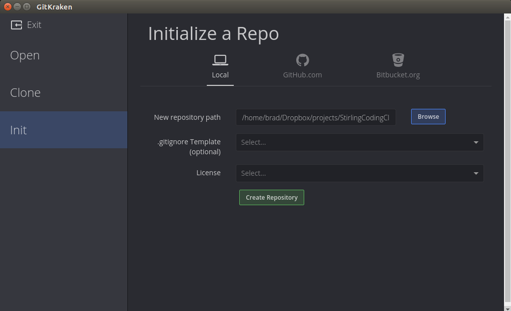 Initialise a git repository using [GitKraken](http://gitkraken.com) by specifying the folder on your computer where you want the repository to be initialised by selecting the 'Init' tab (far left) and the 'Local' tab (top left) within GitKraken. If you cannot figure out how to get the the image below, go to the upper left folder icon within GitKraken.