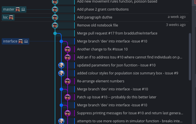 This explains everything about branching and merging, which is a very useful tool once you get used to it. It allows you to quickly start new experimental pathways in a project and make big changes without fear of disrupting anything. When you collaborate, if different people are working on different aspects of a project, each can work on a separate branch to be merged later. You can view a tree of branch history on GitHub in the 'insights' then 'networks' tab in a repository (e.g., [in the vegan R package](https://github.com/vegandevs/vegan/network)). If you're working with multiple collaborators who are all pulling from and pushing to GitHub, making commits, and creating and merging branches (or if you're doing all of these things yourself with multiple branches), things can start to look messy (for another example, see the [Rmarkdown repository](https://github.com/rstudio/rmarkdown/network) in Rstudio). In GitKraken, this is what it can look like with only two people and three branches.