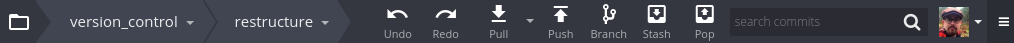 After adding some commits to the branch 'restructure', I might be satisfied with the changes to the repository and therefore want to merge the 'restructure' branch back into the 'master' branch. Merging means incorporating the changes made in one branch into another branch; this works seamlessly when the branch being merged into has not changed (i.e., if after creating and committing on the new branch 'restructure', the original 'master' branch remains untouched). Merging gets slightly more tricky if commits have been made to both branches since the time of branching, but more on this in a moment. To merge in GitKraken, make sure that you are on the branch that you want to merge *to* (i.e., the branch where you have *not* made the changes that you are satisfied with, but the one that you want to send them to). This is shown in the top toolbar.