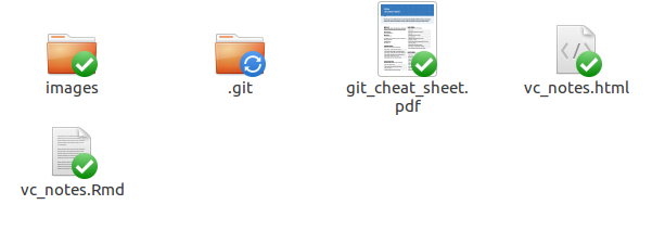 As you work on your files, continue to save things as you normally would; you need to save before files can be added or committed. In the above, you can see the files 'vc_notes.Rmd' and 'vc_notes.html'. These have been saved recently, which is why they are listed as 'Unstaged files' (shown with yellow icons). In the command line, we can see the equivalent of these saved but unstaged files by typing `git status`.