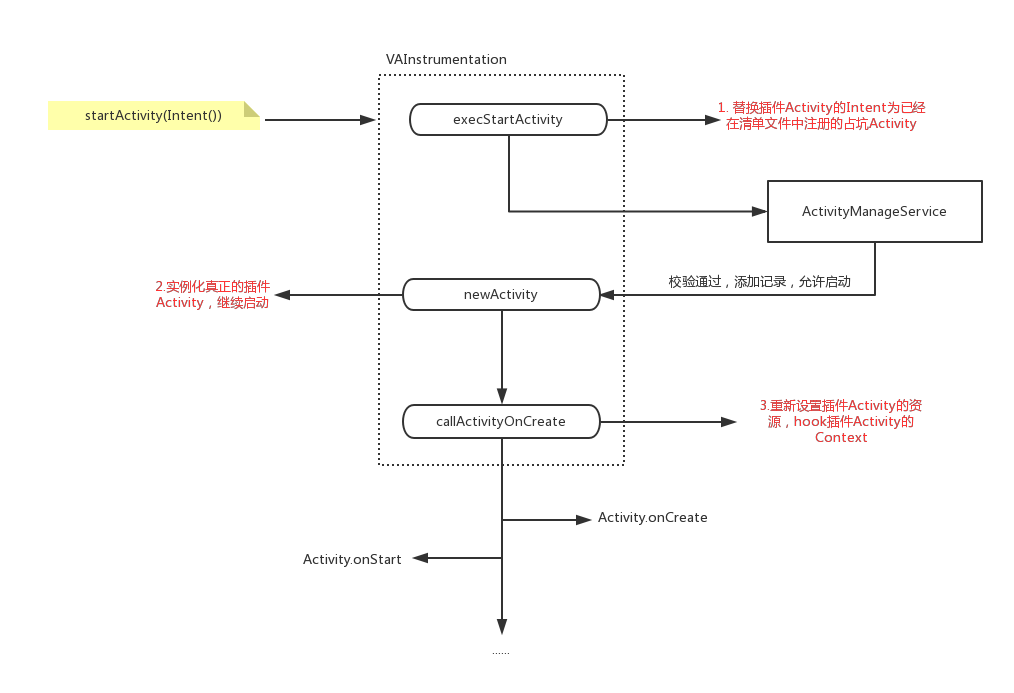好,到这里我们知道对于`插件Activity的启动`,通过hook`Instrumentation.execStartActivity()`,实际上向`ActivityManagerService`请求的启动的是一个`占坑的Activity`。