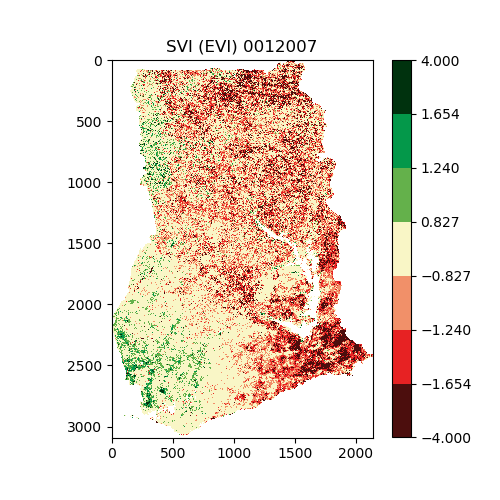 "In this example the Standard Vegetation Index (SVI) is calculated from the Enhanced Vegetation Index (EVI) gained from satellite remote sensing. A MODIS vegetation product (MOD13Q1) with a temporal resolution of 16 days and a spatial resolution of 250m is used (https://lpdaac.usgs.gov/products/mod13q1v006/). "