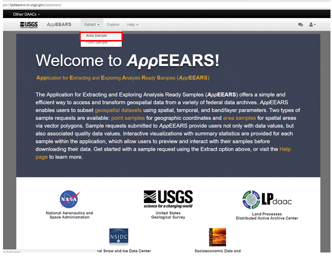 "Access the [AppEEARS website](https://lpdaacsvc.cr.usgs.gov/appeears/) and create a user account (free) for USGS in case you do not already have one. Click on __Extract__ and __Area Sample__ and start a new request."