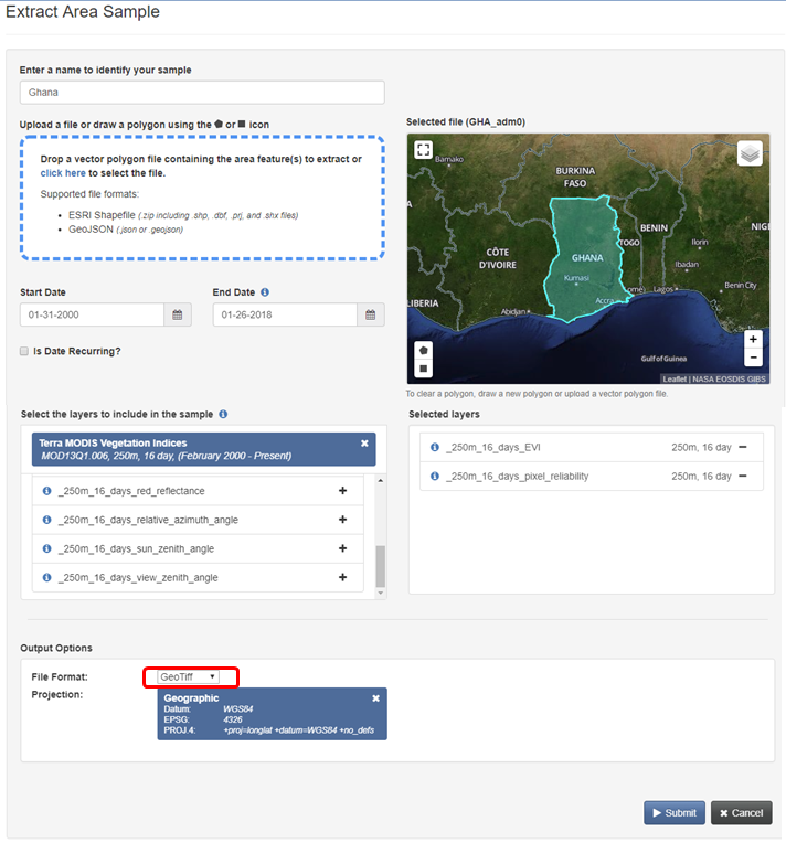 "4. Select the product: __MOD13Q1__ and the layers of interest: __EVI__ and __pixel_reliability__\n",