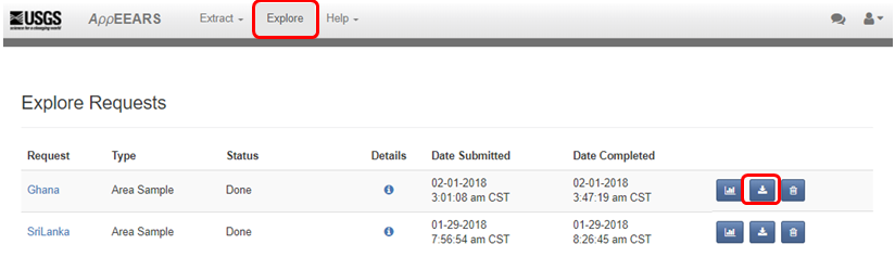 "Click on __Explore__ to check the status of the request. When the status says \"Done\" you can click on the __Download__ symbol. __Select all__ ordered datasets and start downloading the data."