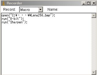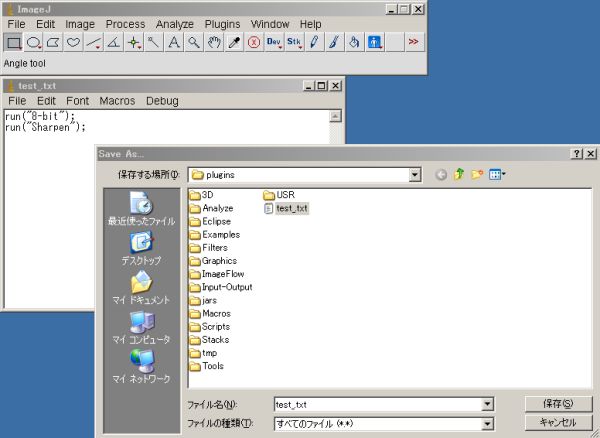 - File ⇒ Save で、ImageJフォルダ内のpluginsフォルダにマクロを保存します
