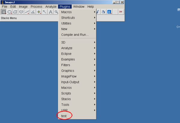 - 画像を開いた状態で、Plugins→testを実行してみてください。