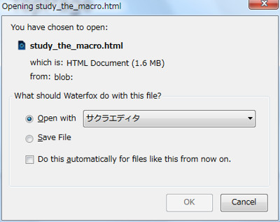Gecko系のブラウザの場合、以下のような画面が開きますので、Open withを選択し、アプリケーションに「サクラエディタ」を選択します。