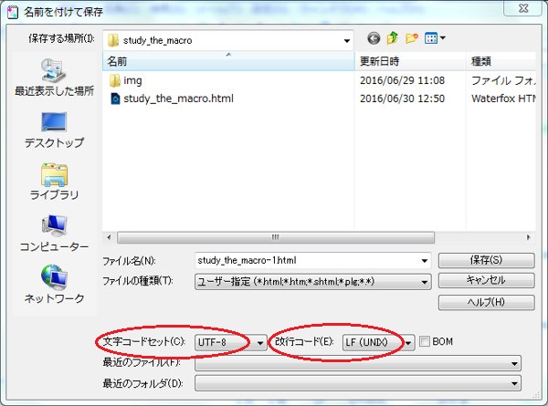 保存の際に重要なのは、文字コードセットを「UTF-8」、改行コードを「LF (UNIX)」にすることです(図3)。
