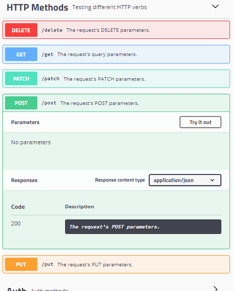 エコーサーバーは、httpbin.org を利用します。トップページには、A simple HTTP Request & Response Service.(単純なHTTP要求および応答サービス)とあります。今回はPOSTを利用します。