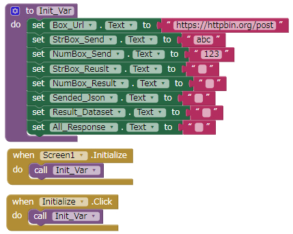 を使って初期化の振舞いを設定します(画像3のInit_Var)。アプリケーションの起動時と「Initialize」ボタンが押された時に実行されるようにします。