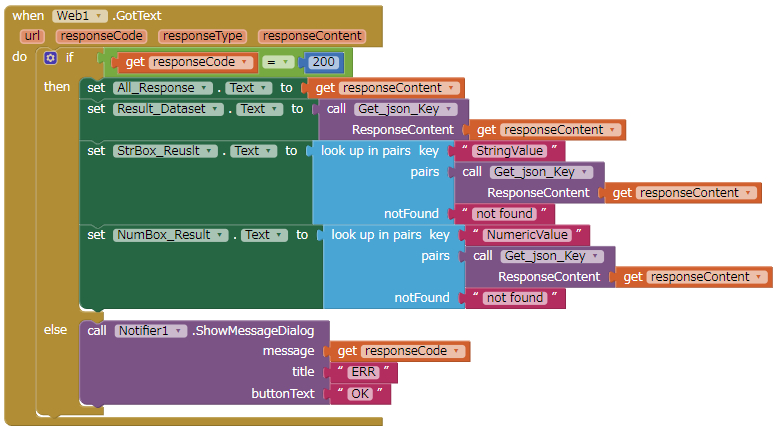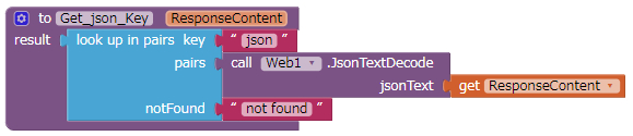 正常時はデータを抽出します。全レスポンスからの抽出は、先ほど作った「Get_json_Key」関数を使います。App Inventor2の形式のデータセットからの抽出は、
